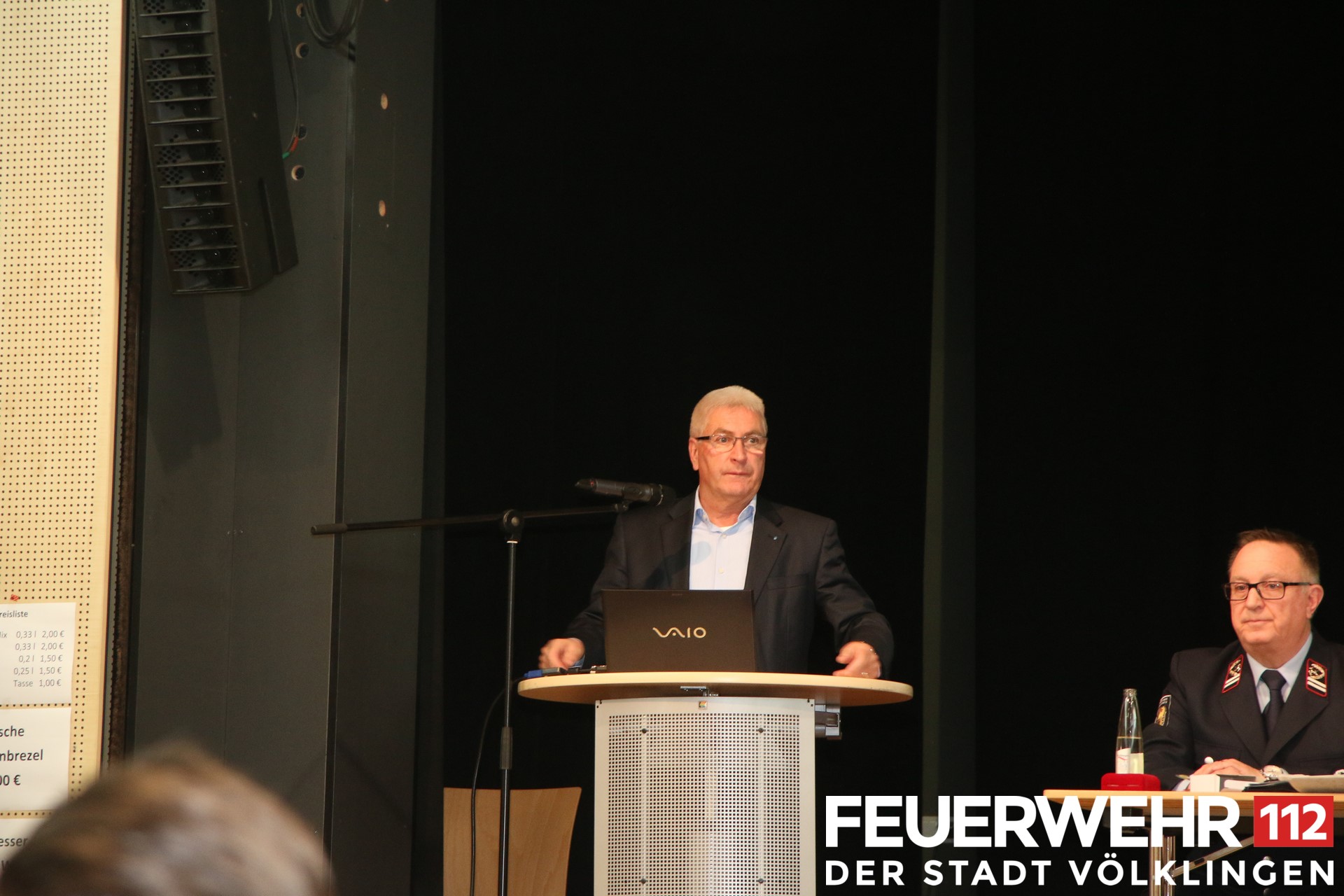 OB Lorig richtete als erstes seine Grußworte an die Kameraden. Er gab einen kurzen Überblick über die Maßnahmen, die im vergangenen Jahr getätigt wurden sowie einen Ausblick auf das Jahr 2017. So wurden in 2016 die Küche in Lauterbach erneuert, die Reparatur des Daches in Ludweiler wurde begonnen, in Geislautern wurde mit Spatenstich zum Neubau eines Gerätehauses angefangen und auch im Löschbezirk Wehrden sind die Umbauarbeiten weit fortgeschritten. Auch konnte im letzten Jahr ein HLF 20/20 dem Löschbezirk Ludweiler übergeben werden. Momentan sind 2 weitere Fahrzeuge für die Löschbezirke Wehrden und Fürstenhausen in der Beschaffung. Des Weiteren soll 2017 mit der Planung für den Umbau des Gerätehauses Stadtmitte begonnen werden.