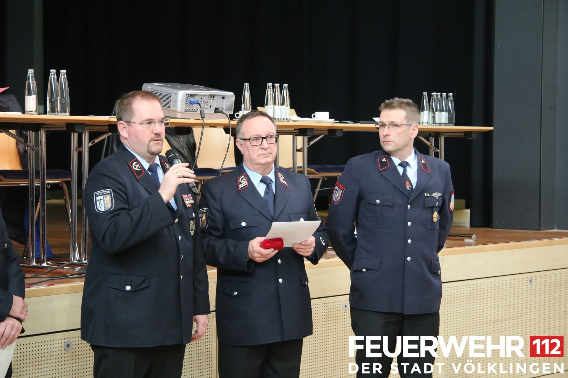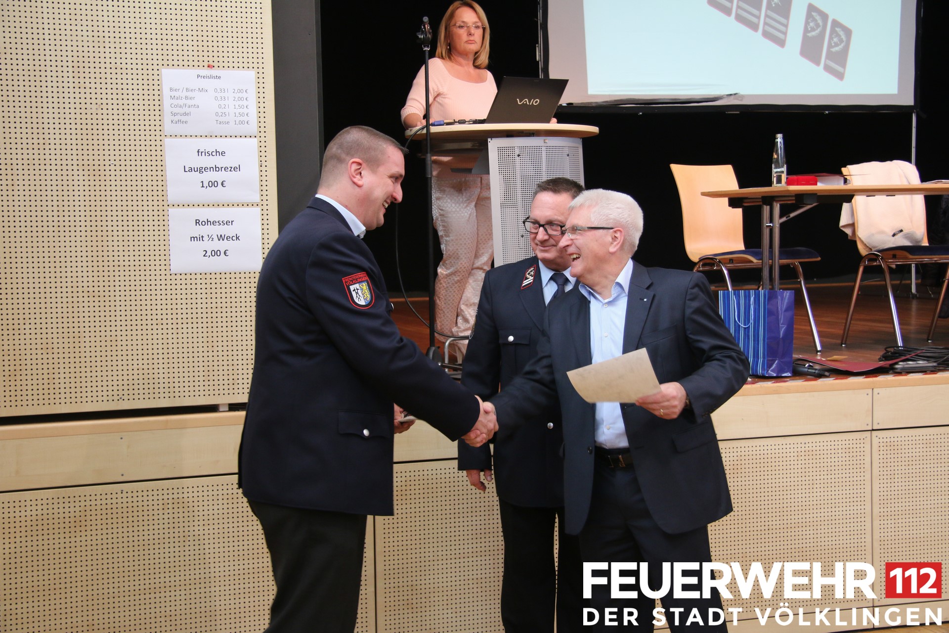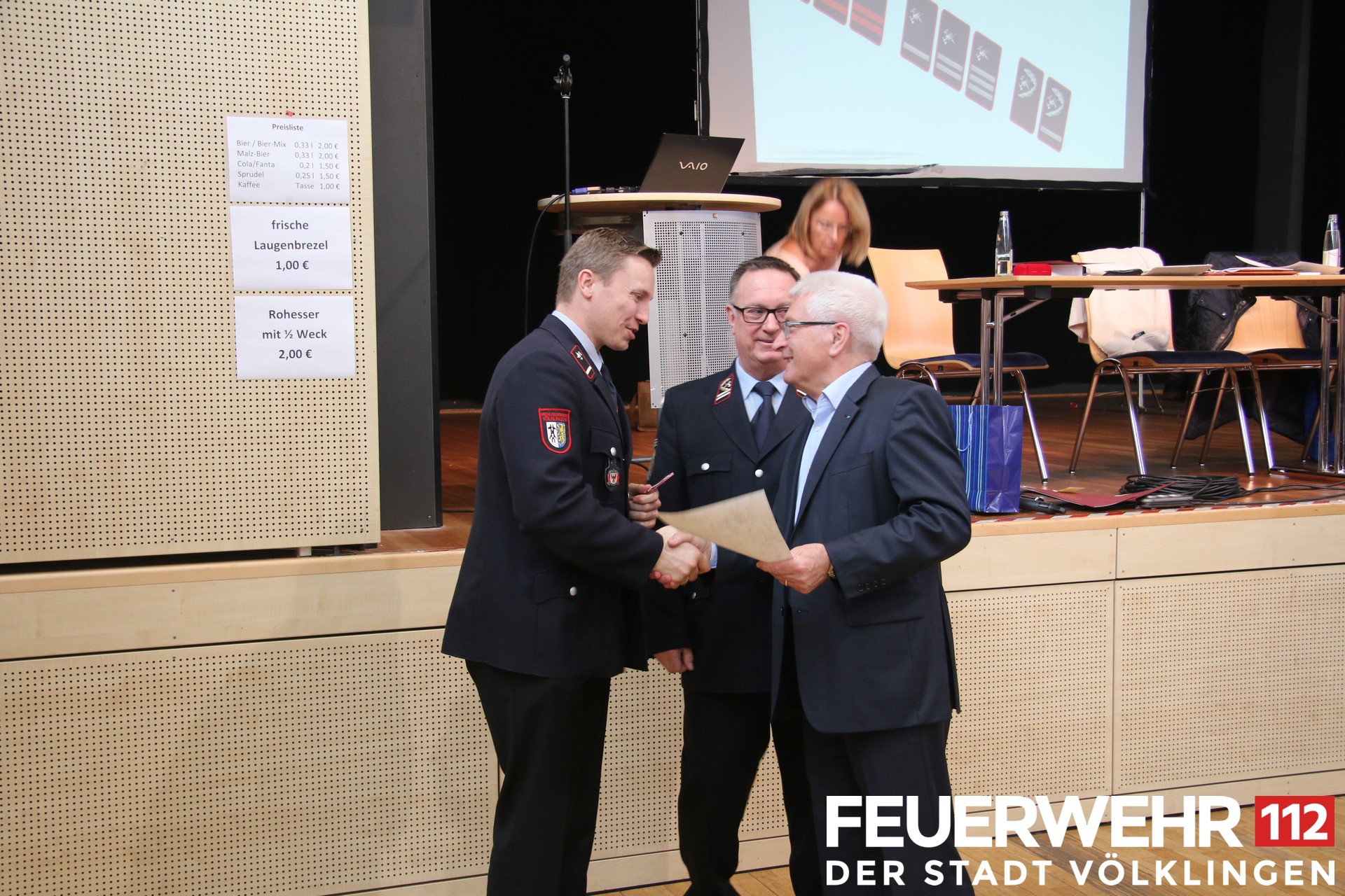 Nach den Beförderungen wurde dem Kameraden Michael Rödel die Ehrenmedaille der Feuerwehr Völklingen verliehen. Diese wird für besondere Verdienste bei der Feuerwehr Völklingen überreicht. Michael Rödel hatte bei 2 Einsätzen, schon bereits vor Eintreffen der alarmierten Kameraden, die Personen aus den brennenden Häusern gerettet.