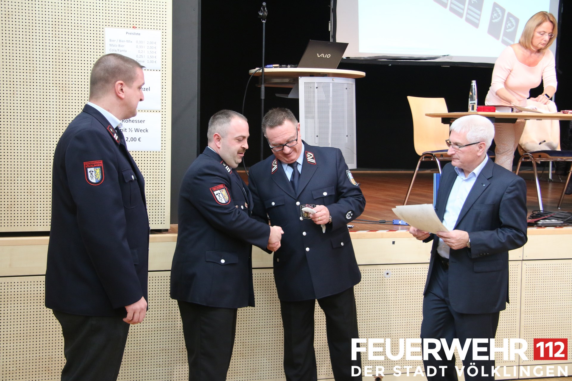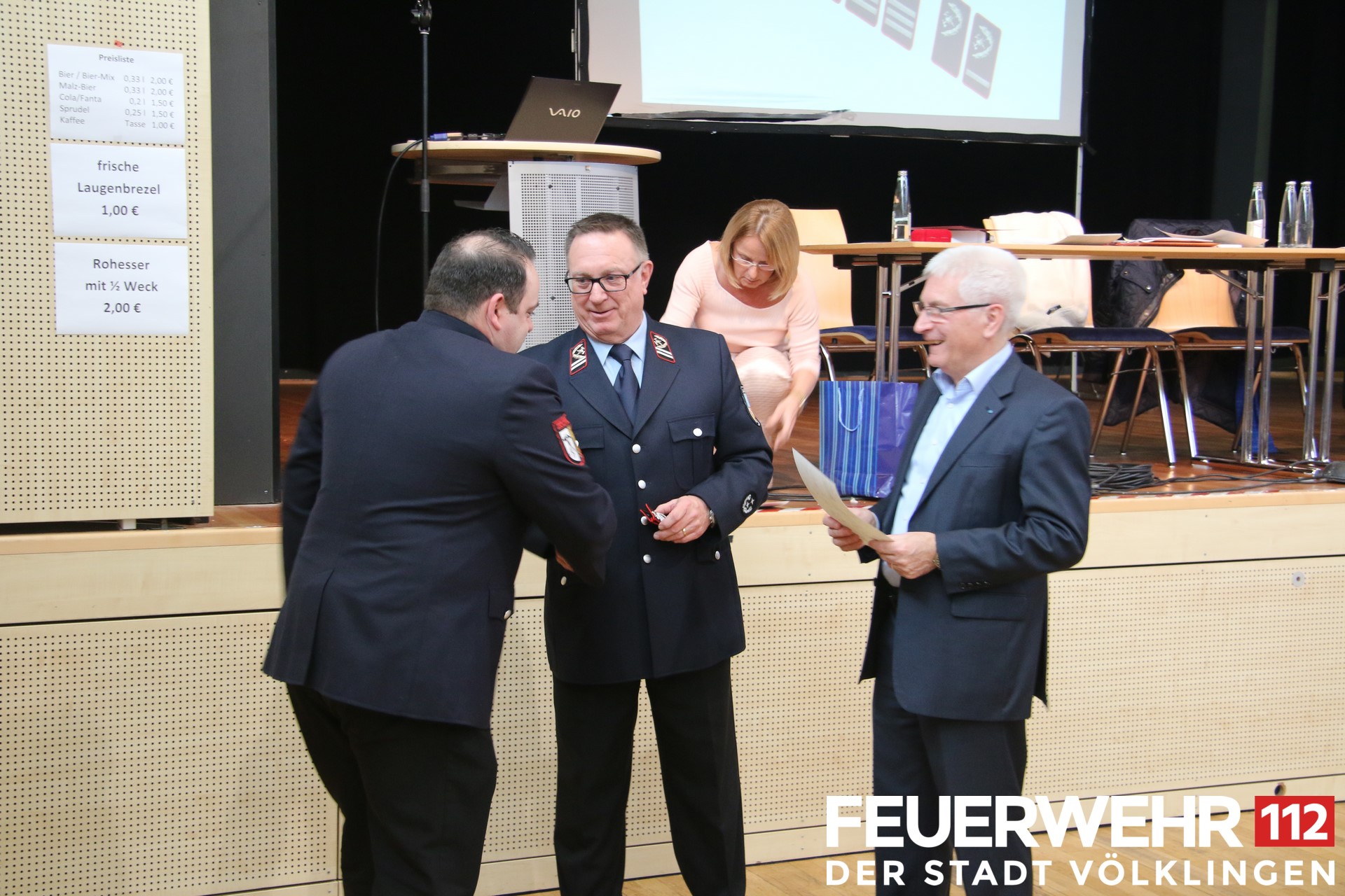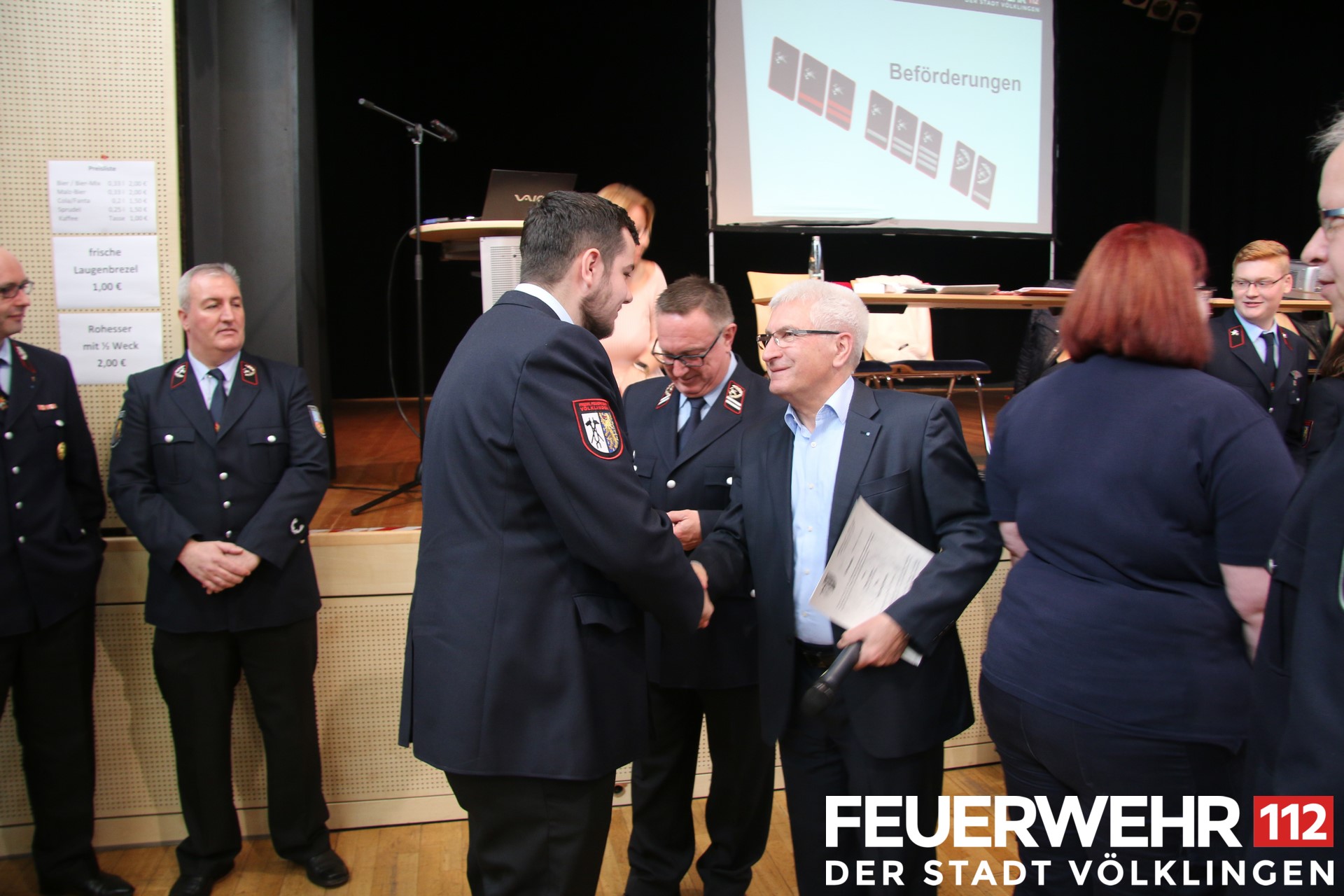 Nach den Beförderungen wurde dem Kameraden Michael Rödel die Ehrenmedaille der Feuerwehr Völklingen verliehen. Diese wird für besondere Verdienste bei der Feuerwehr Völklingen überreicht. Michael Rödel hatte bei 2 Einsätzen, schon bereits vor Eintreffen der alarmierten Kameraden, die Personen aus den brennenden Häusern gerettet.