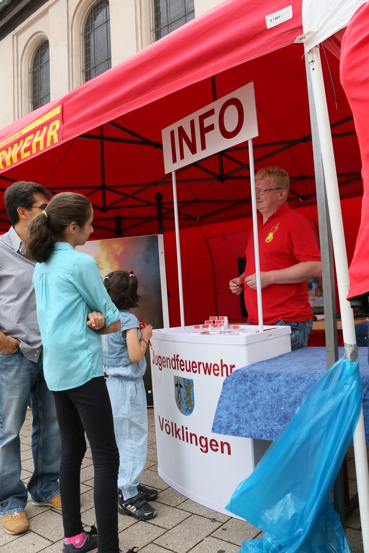 Auch beim diesjährigen Weltkindertag war die Jugendfeuerwehr Völklingen mit einem Stand vertreten. An der Eligiuskirche konnten sich die Besucher über die Arbeit der Jugendwehr informieren. Neben fachkundigen Auskünften von den Jugendlichen selbst, konnte man sich bei Ausbildern ein Bild der Jugendfeuerwehr Völklingen machen.