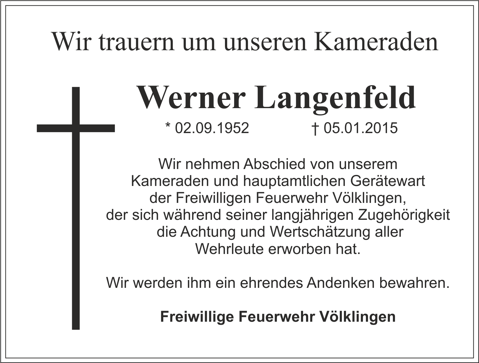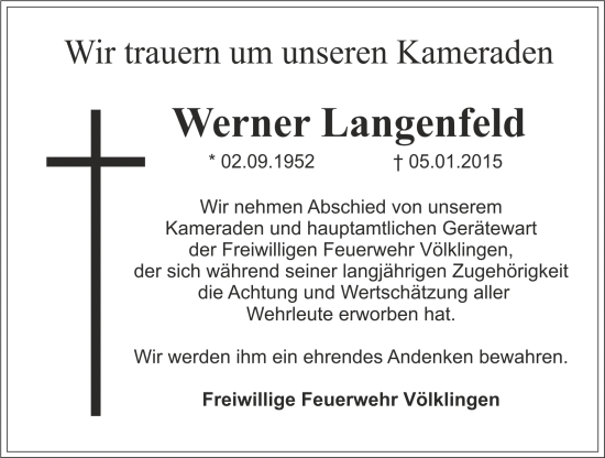 Nach schwerer Krankheit ist am 05.01.2015 unser Kamerad Werner Langenfeld verstorben.