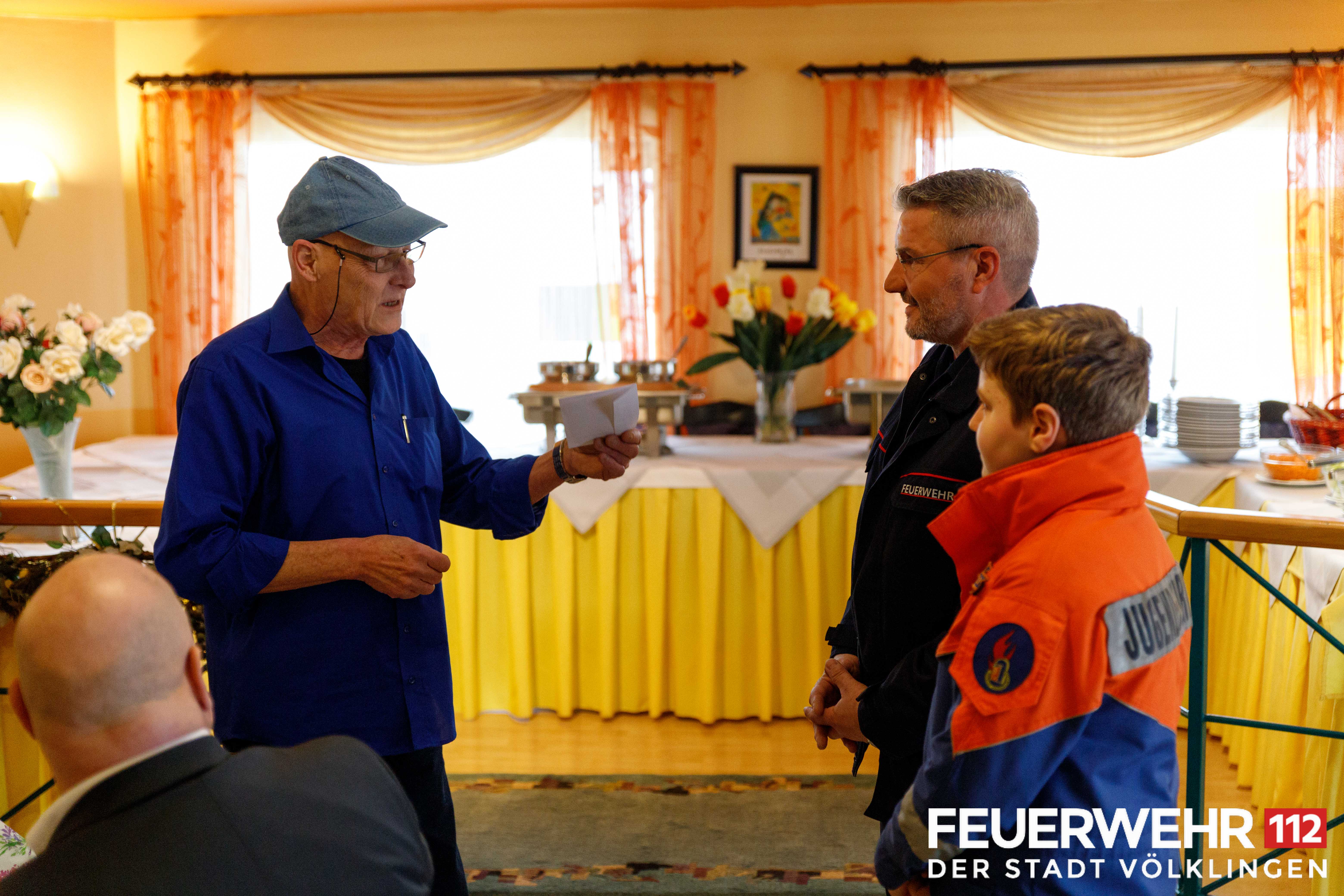 Michael Schneider (stellvertretender Stadtjugendwart der Feuerwehr Völklingen) und Florian Hübschen (Mitglied der Jugendfeuerwehr), nahmen die Spende für die Feuerwehr entgegen und bedankten sich für die Einladung und die überreichte Spende.
