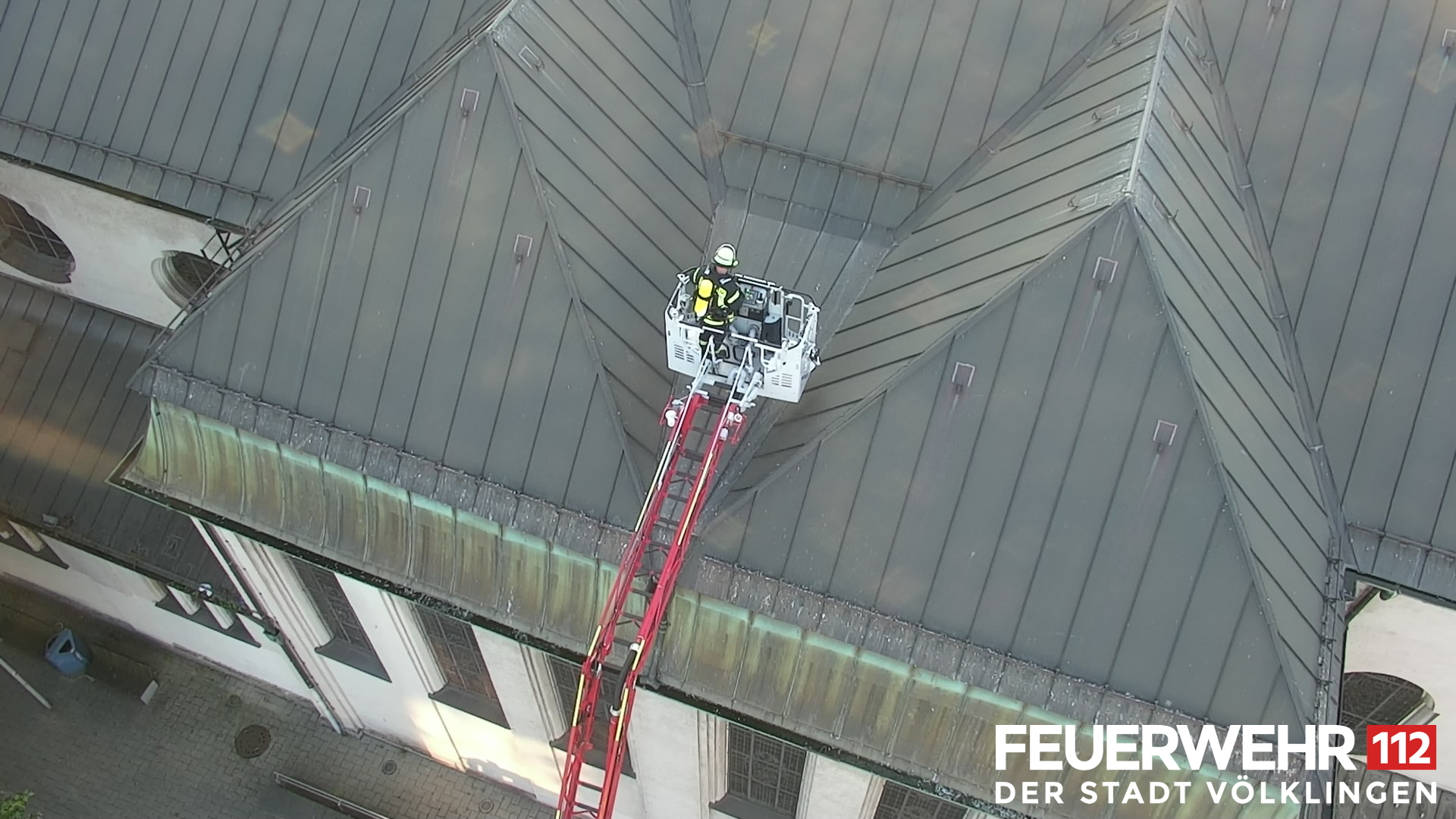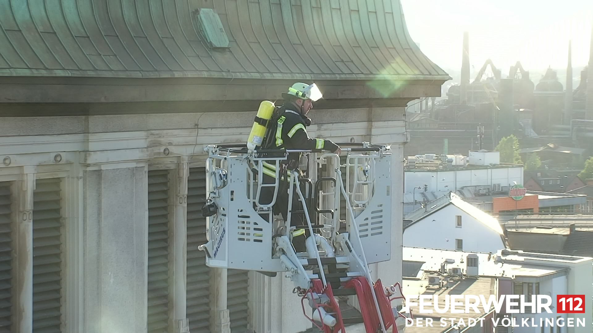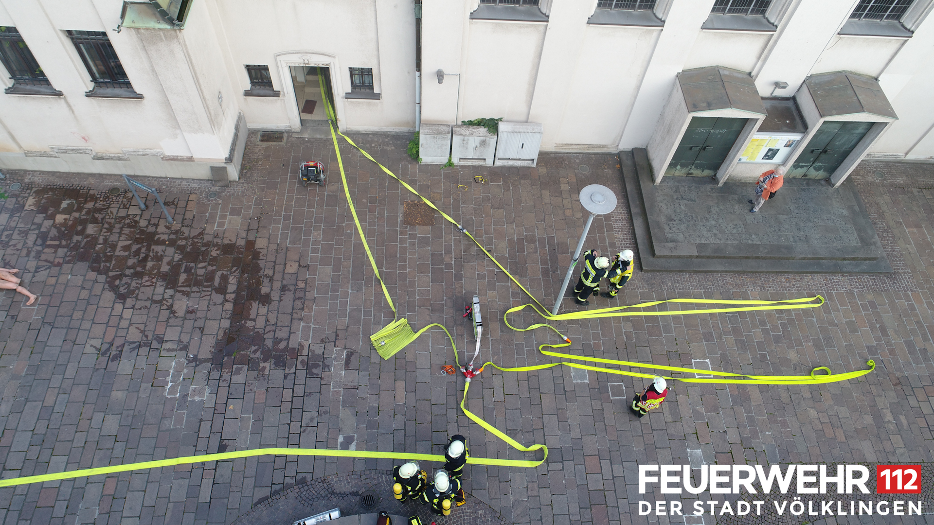 Zur ersten Übung nach den Sommerferien traf sich der LB Stadtmitte unterstützt von der ELW2-Einheit des LB Geislautern am 01. September 2021. Übungsziel war das Kennenlernen eines außergewöhnlichen Gebäudes mitten in Völklingen – der Pfarrkirche St. Eligius. Schwierigkeiten für die Feuerwehr bilden hier besonders die verwinkelten Gänge zu Heizungskeller und Kirchturm. Daher wurde zur Lage angenommen, dass bei Wartungsarbeiten an der Heizung ein Brand ausbricht und zwei Arbeiter durch Feuer und Rauch im Keller eingeschlossen werden. Gleichzeitig stürzt ein Arbeiter im Kirchturm ab und muss mit der Schleifkorbtrage aus rund 30 Metern Höhe gerettet werden. Die vielen Passanten rund um den Pfarrgarten und den Adolph-Kolping-Platz konnten sich ein Bild von der Arbeit der Einsatzkräfte machen, denen es zügig gelang, die gestellten Aufgaben aus Menschenrettung und Brandbekämpfung zu bewältigen. Ein herzlicher Dank geht an den Verwaltungsrat der Pfarrgemeinde und Pfarrer Thomas Weber, die uns die Übung freundlich genehmigt haben. Ein großes Dankeschön geht auch an Familie Gothier, die uns Tür und Tor geöffnet hat und an Pfarrsekretärin Sandra Rein, die uns während der Vorbereitungen unterstützt hat.
