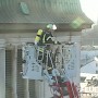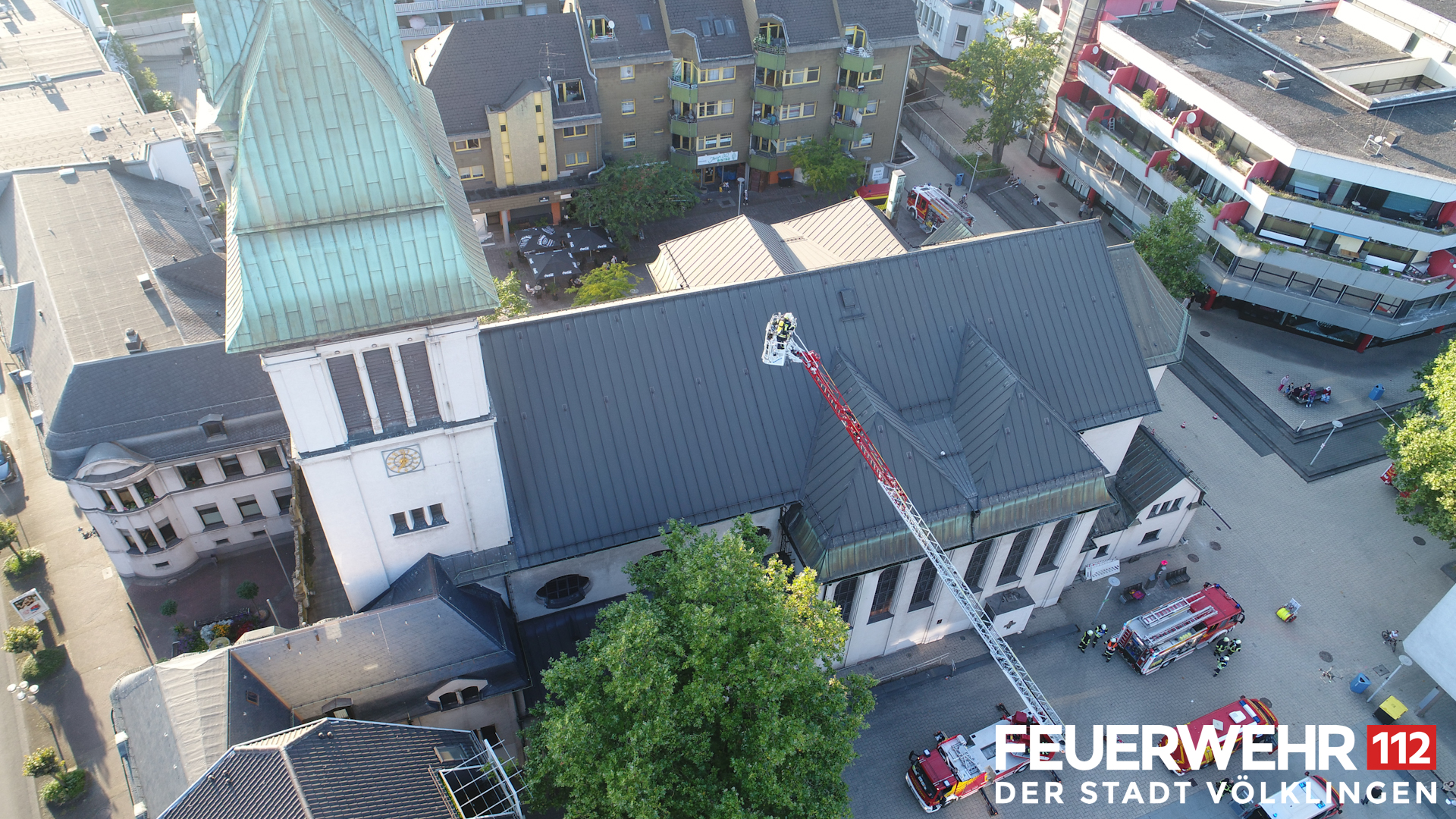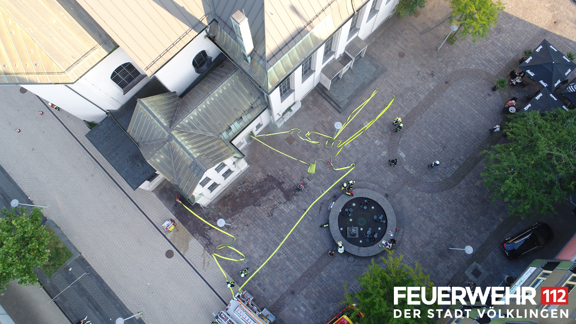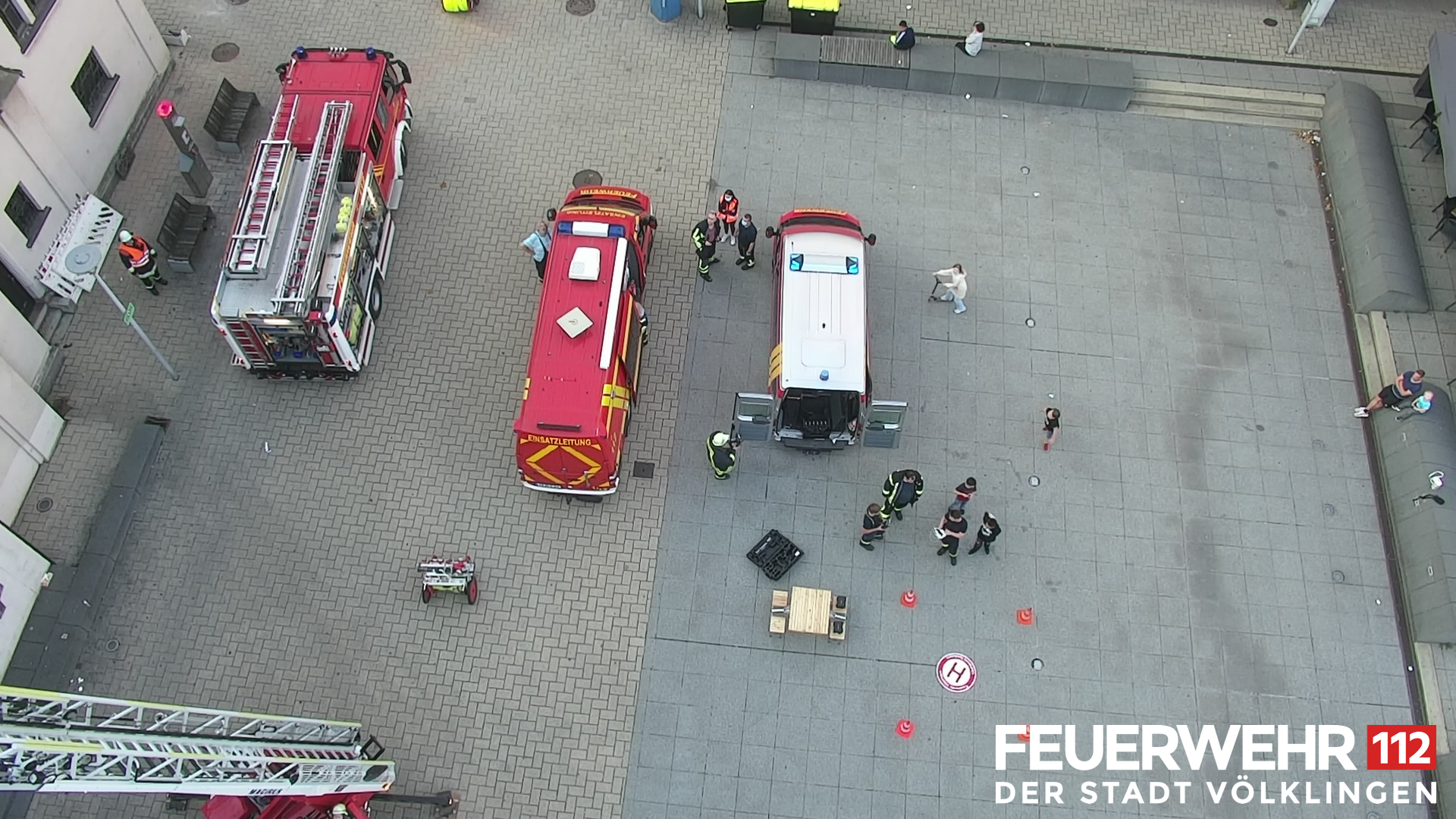 Zur ersten Übung nach den Sommerferien traf sich der LB Stadtmitte unterstützt von der ELW2-Einheit des LB Geislautern am 01. September 2021. Übungsziel war das Kennenlernen eines außergewöhnlichen Gebäudes mitten in Völklingen – der Pfarrkirche St. Eligius. Schwierigkeiten für die Feuerwehr bilden hier besonders die verwinkelten Gänge zu Heizungskeller und Kirchturm. Daher wurde zur Lage angenommen, dass bei Wartungsarbeiten an der Heizung ein Brand ausbricht und zwei Arbeiter durch Feuer und Rauch im Keller eingeschlossen werden. Gleichzeitig stürzt ein Arbeiter im Kirchturm ab und muss mit der Schleifkorbtrage aus rund 30 Metern Höhe gerettet werden. Die vielen Passanten rund um den Pfarrgarten und den Adolph-Kolping-Platz konnten sich ein Bild von der Arbeit der Einsatzkräfte machen, denen es zügig gelang, die gestellten Aufgaben aus Menschenrettung und Brandbekämpfung zu bewältigen. Ein herzlicher Dank geht an den Verwaltungsrat der Pfarrgemeinde und Pfarrer Thomas Weber, die uns die Übung freundlich genehmigt haben. Ein großes Dankeschön geht auch an Familie Gothier, die uns Tür und Tor geöffnet hat und an Pfarrsekretärin Sandra Rein, die uns während der Vorbereitungen unterstützt hat.