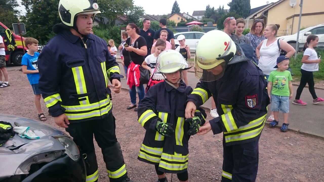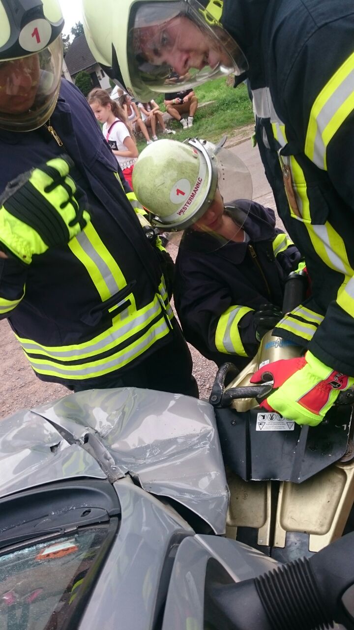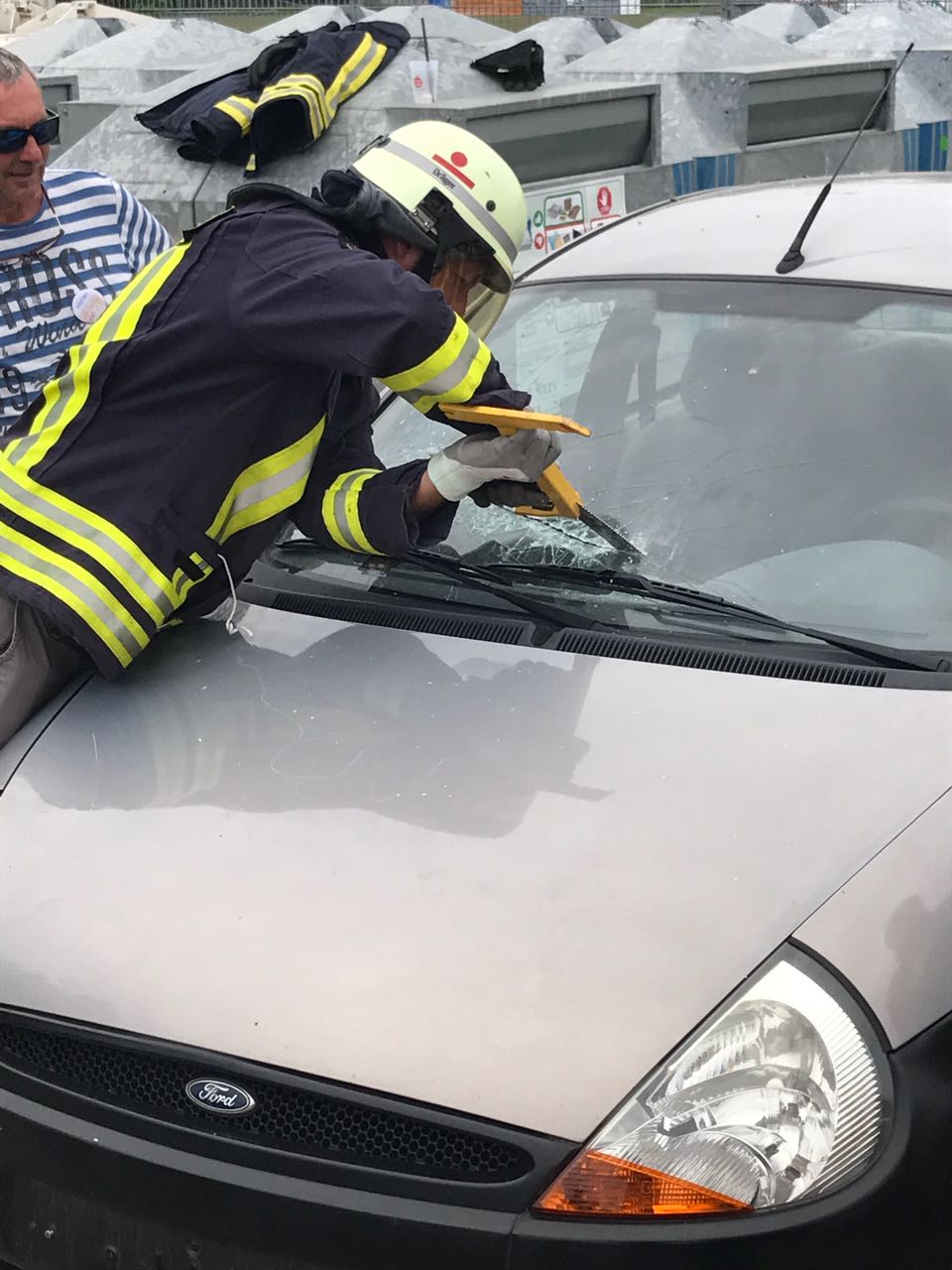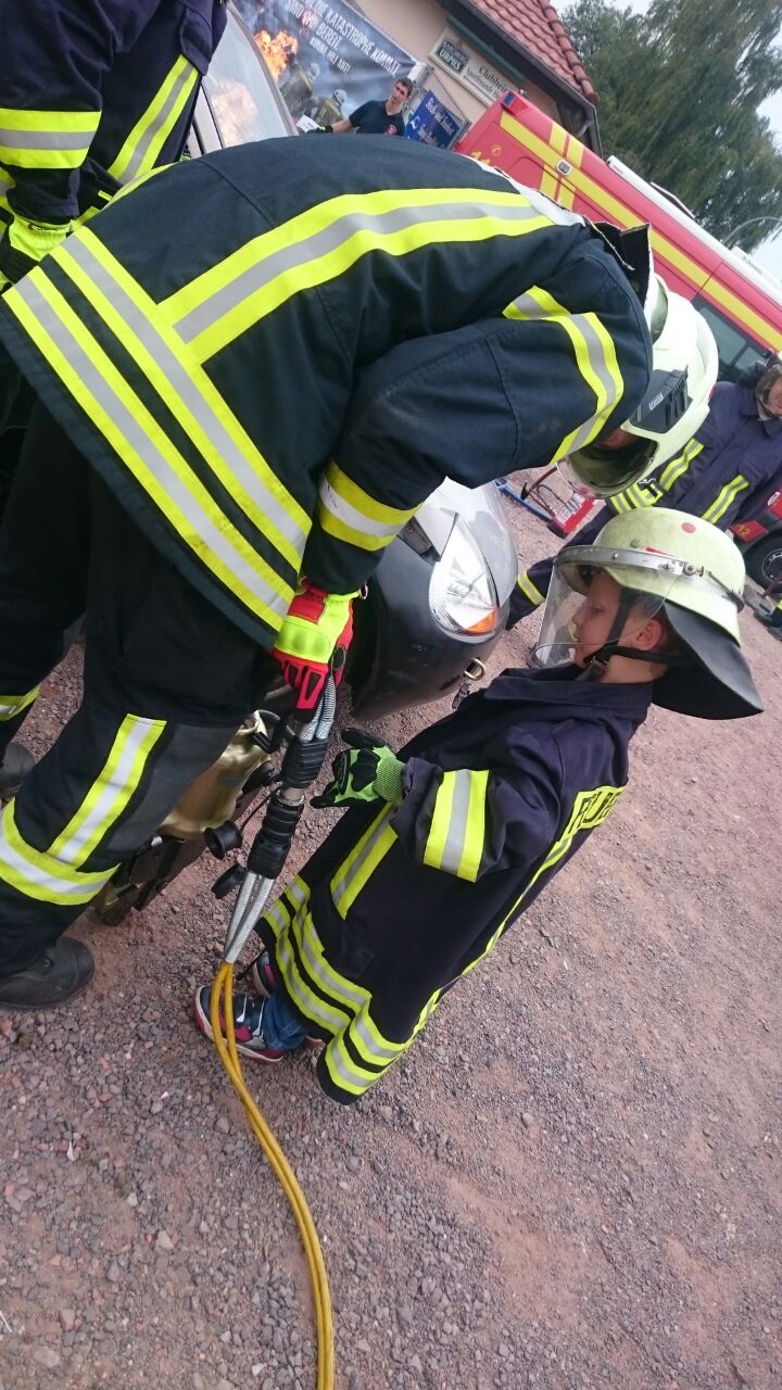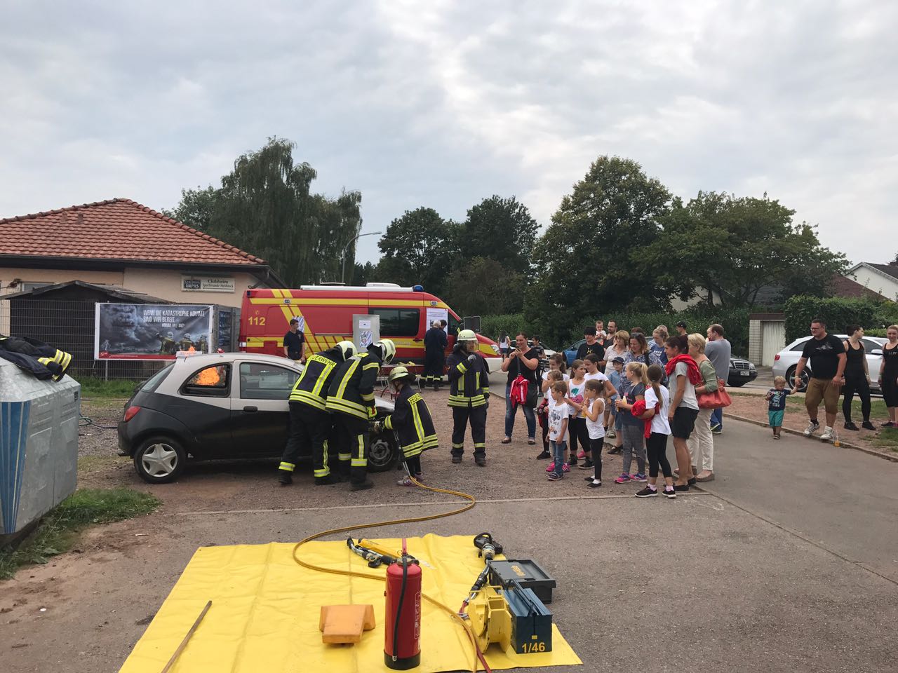 Durch den LB Stadtmitte wurde das Vorgehen an einem PKW mittels Hydraulischem Rettungssatz (Schere und Spreizer) gezeigt. Auch hier durften kleine und große Interessierte, (natürlich unter sachkundiger Anleitung) mal selbst Hand an die Geräte legen.