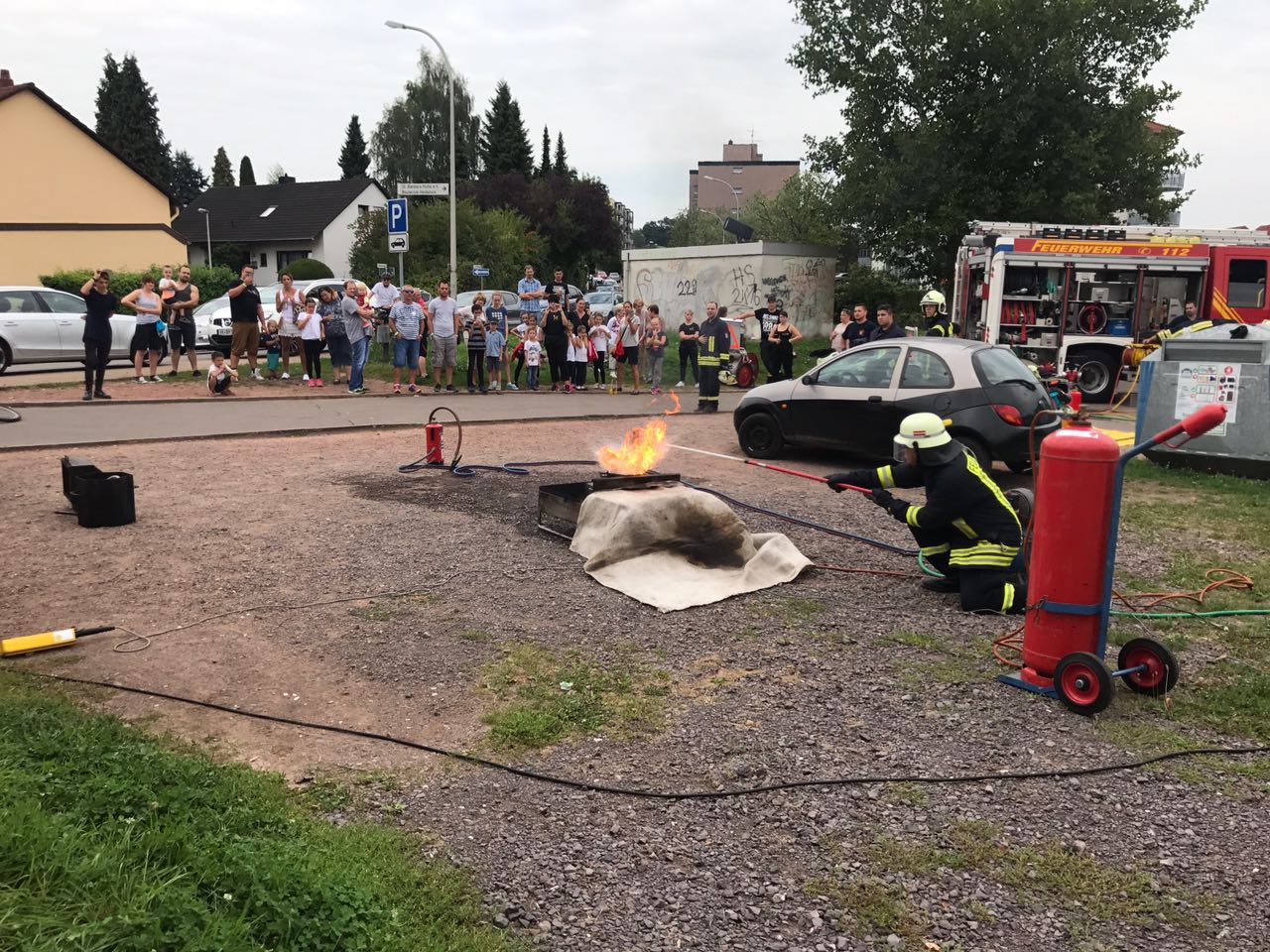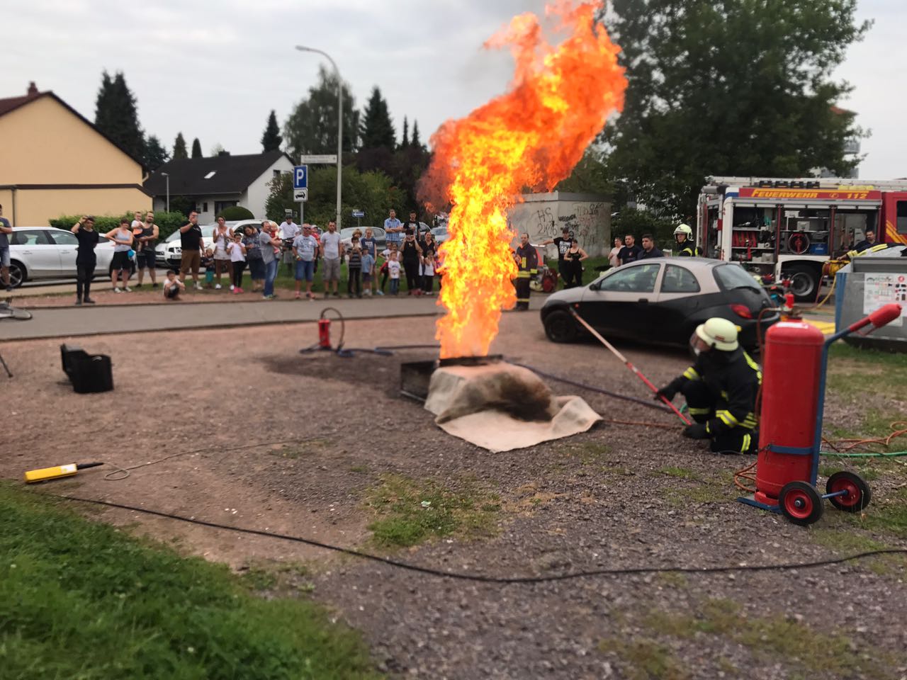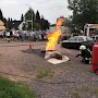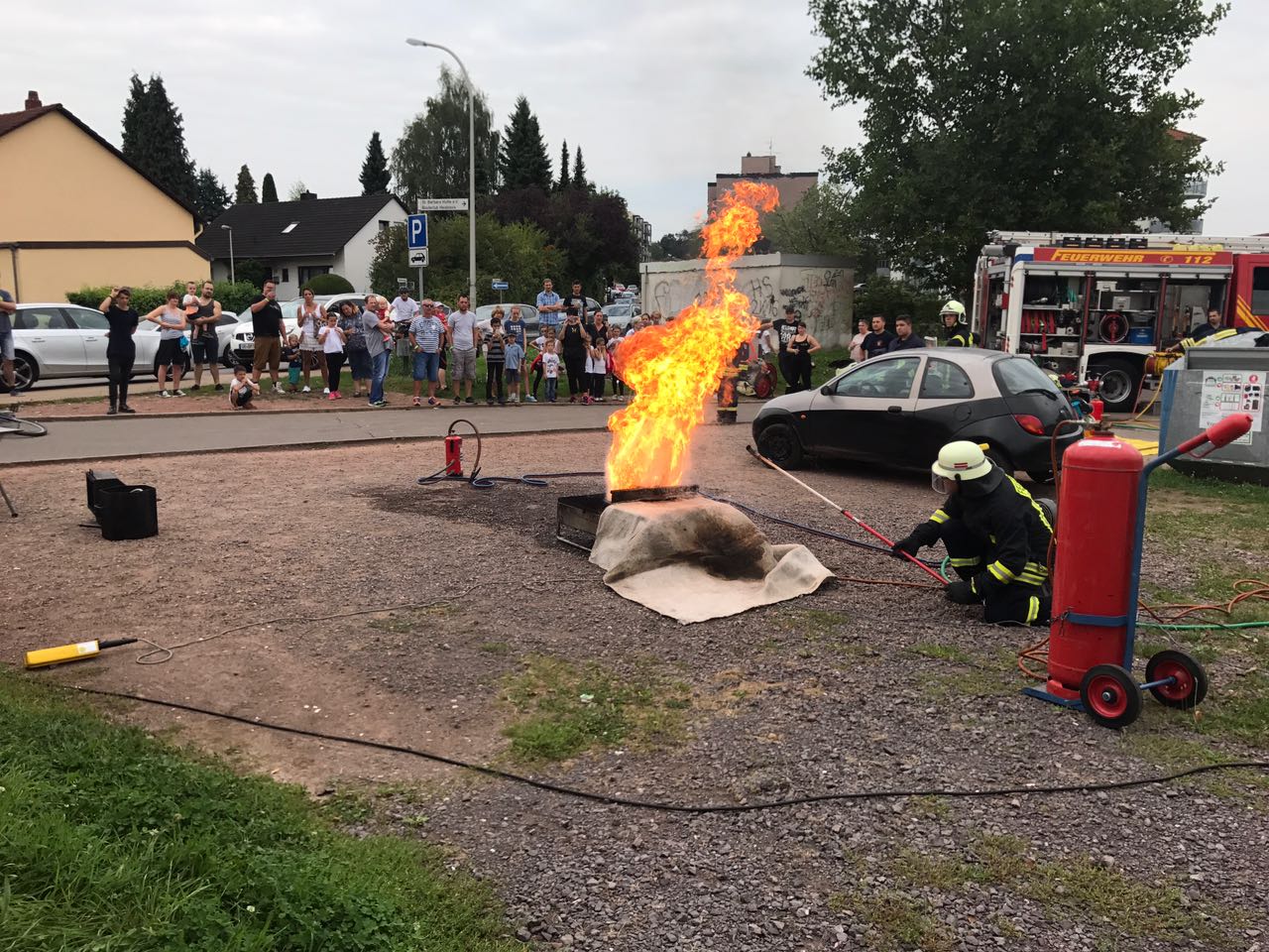 Mit der Brandsimulationsanlage wurde z.B. gezeigt, was bei Einsatz von Wasser mit Fettbränden passieren kann. Auch konnten hier die Bürger das Benutzen von Feuerlöschern üben.