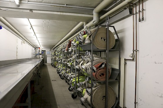 Die Feuerwehr Völklingen verfügt über eine eigene Schlauchwaschanlage. Diese befindet sich im Untergeschoss der Feuerwache. Hier werden nasse und verschmutzte Schläuche aller Größen gereingt, nach einer Dichtigkeitsprüfung im Schlauchturm getrocknet und im Materiallager wieder einsatzbereit gelagert.