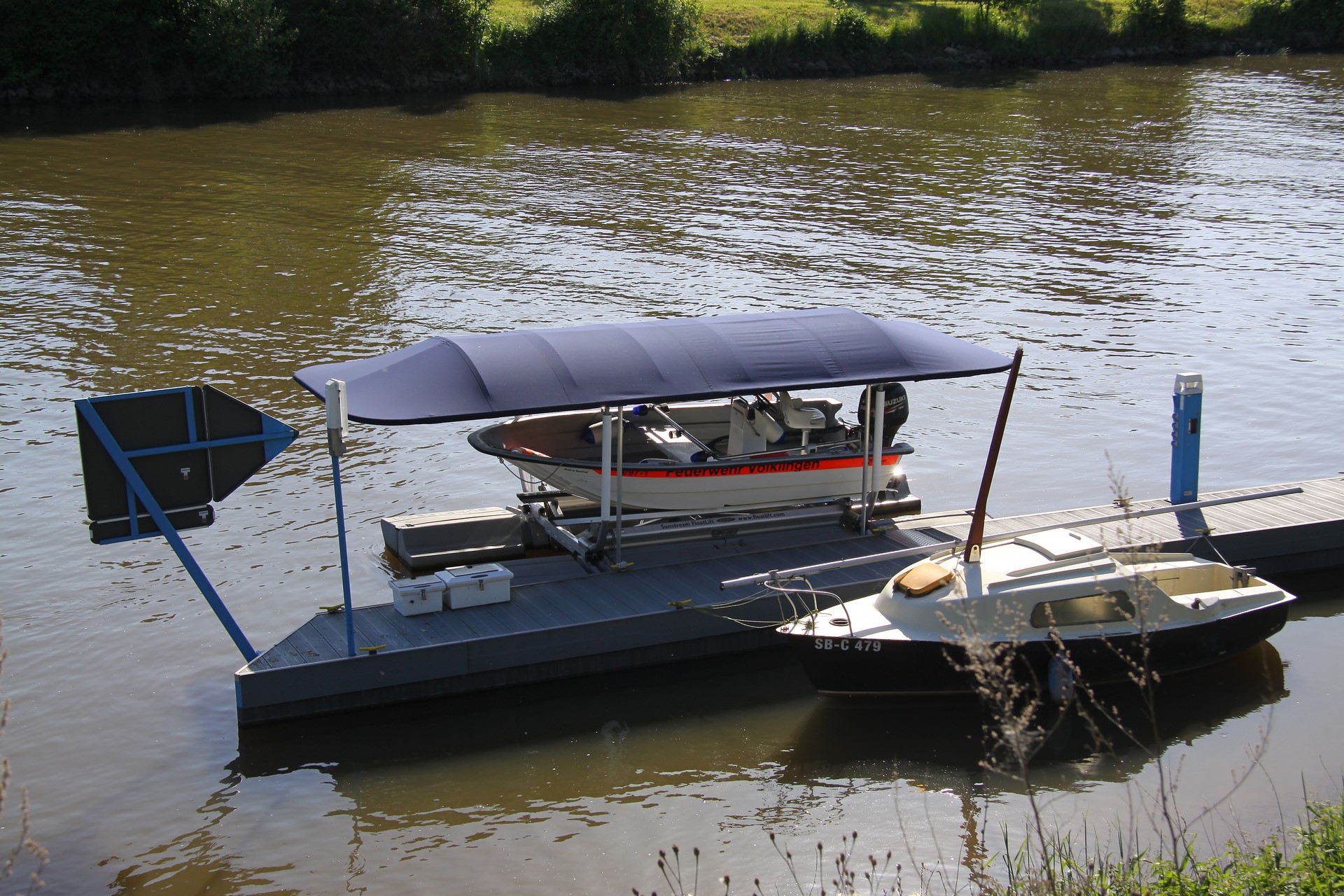 Das Rettungsboot Florian Völklingen 4/97-1 liegt dauerhaft an der Bootsanlegestelle in Wehrden.