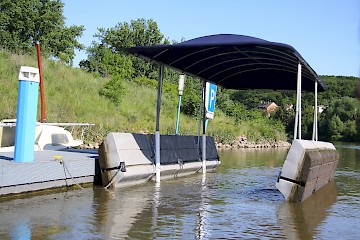 Das Rettungsboot wird mit einem Bootslift aus dem Wasser gehoben, um es vor Verwitterung zu schützen und einen schnellen Einsatz zu ermöglichen.